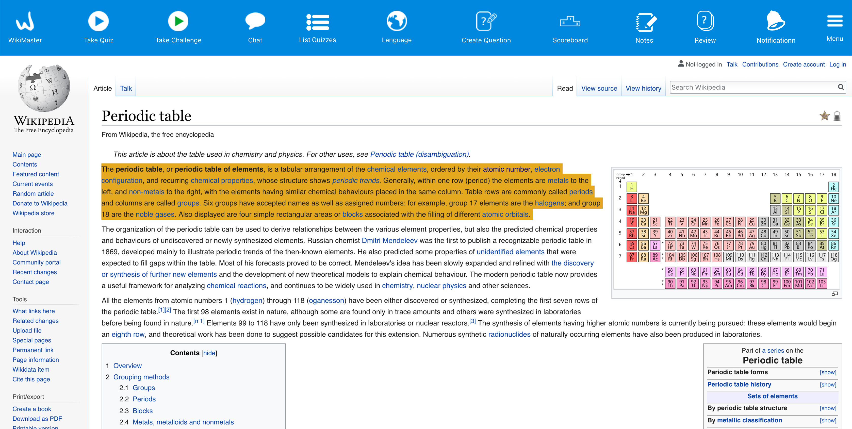 A- In wide screens, the Wikipedia article will be displayed with some helpful functions and features in the top blue bar. By clicking on those menu items you can navigate to any part of the site. In widescreens, a lot of functions and features will be displayed to fill the blue WikiMaster bar, and fill the Wikipedia page with a lot of added possibilities.